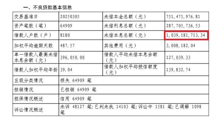 公告显示,该笔不良贷款未偿本息总额10.39亿元,涉及资产笔数6.49万笔,借款人户数8180户,借款人加权平均年龄39.04岁,加权平均逾期天数487.57天,单一借款人最高未偿本息余额39.61万元。根据五级分类及诉讼情况,上述不良贷款损失6.49万笔。目前未诉4.81万笔,已判未执1.41万笔,诉讼中1581笔,已调解1098笔。